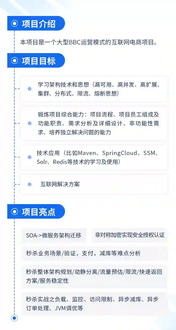 通过框架阶段的学习之后,会将一个单体架构的电商项目给到学员,然后通过分布式相关核心技术的学习,将单体架构进行分布式架构的项目重构,实现分布式的电商项目。