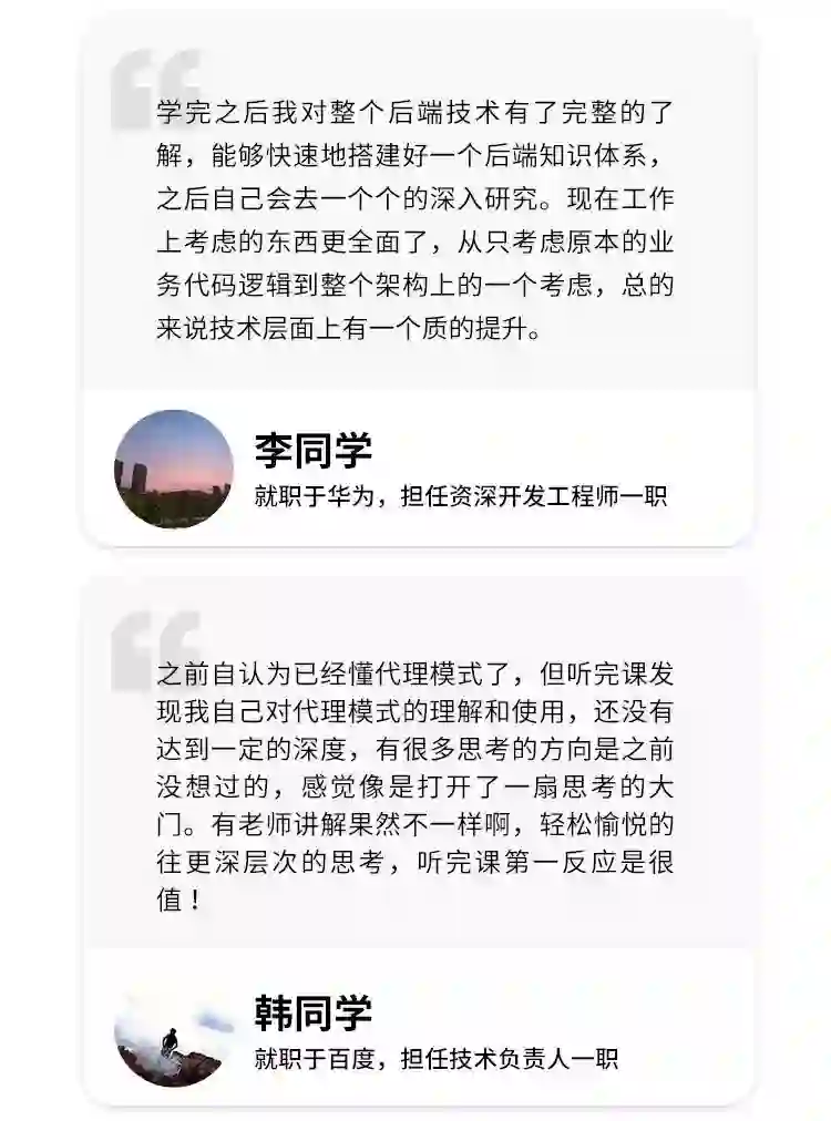 名师带队 + 内容高度匹配大厂 + 课程服务周到 + 为坚持学习的人免单,非常适合需要突破职场瓶颈、挑战大厂业务场景的技术人。这里争取到了 10 个培优名额的机会,最近想要冲击高薪的朋友,可以添加助教老师微信预约。本期课程报名日期即将截止,需要了解更多课程信息的朋友,也可以扫码咨询。