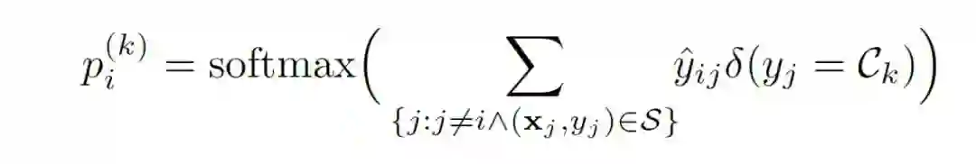 c)在数次的节点、连接边特征迭代更新之后,我们可以从最近更新的边特征上得到最终的节点类别预测,用非常直接的加权投票(weighted voting)方法,结合支持集 S 里的样本标签以及它们与查询样本连接边的预测值,我们就可以很容易的推出待查询样本的所属类别,节点的预测概率可以表达为: