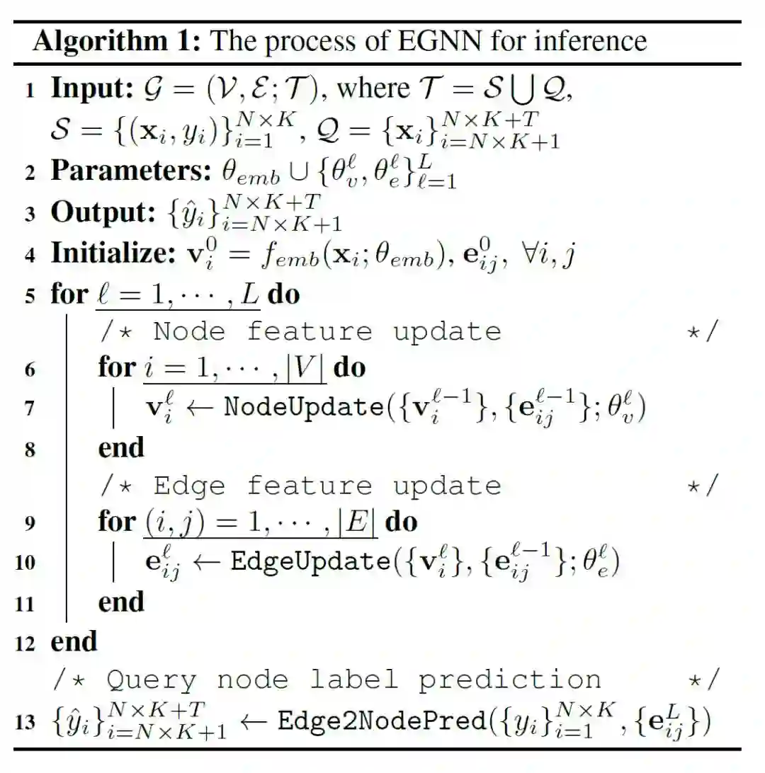 常见的图网络关注于节点的表示与特征嵌入,为了更充分的利用节点的关联信息,本篇论文提出了边标记图网络(Edge-Labeling Graph Neural Network,EGNN),类比于关注节点信息的 GNN,EGNN 通过迭代更新连接边的信息直接可以反映节点之间的类内相似度(intra-cluster similarity)与类间差异度(inter-cluster dissimilarity)从而获取正确的类别分配结果。另一方面,EGNN 在无需 re-train 的情况下能很好地适应不同数目的类别,并且很容易扩展到转换式推理(Transductive Inference)上面,同时在现有的 GNN 方法中,EGNN 在分类任务上实现了大幅的性能提升。