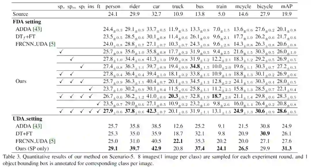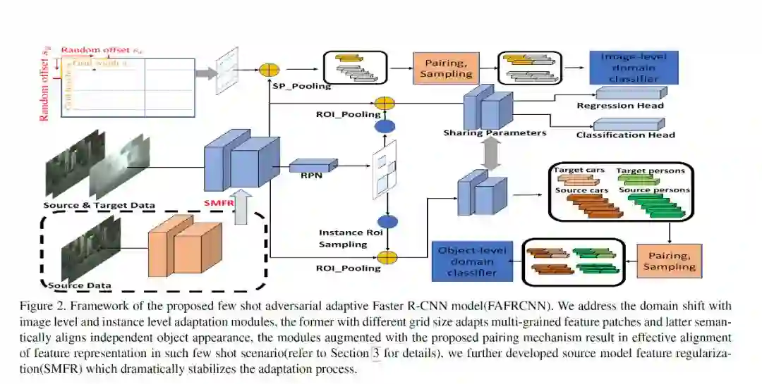 本篇论文着眼于以上问题,探索了仅仅依靠少量目标域标记数据来训练一个检测器完成区域适应的可能性,提出了名为 FAFRCNN(few-shot adaptive Faster R-CNN)的网络结构,这个新的框架由图像(image)与实例个体(instance)两层级的的适应模块组成,并搭配一个特征配对机制,与一个强力的正则化,配对机制的引入,使得图像层级的模块能够均衡地抽取并对齐成对的多粒度特征(multi-grain patch features),最终更好的捕捉全局的域变换(global domain shift),例如说光照,而在个体对象层级上,语义上成对匹配的个体特征能够更好地提供不同物体类别之间的区分度,消除不确定性。另一边,强化的正则引入,它能够使得适应过程训练更加稳定并且避免过度适应(over-adaption)问题的发生。