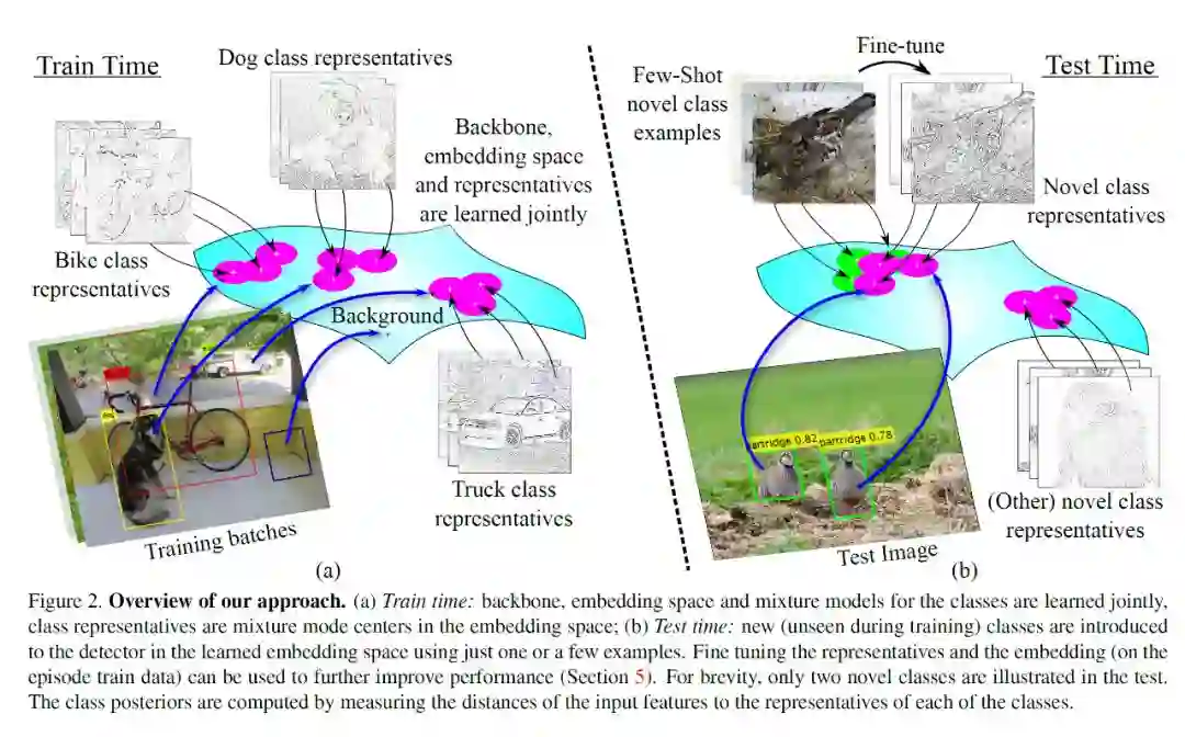 在深度度量学习的大框架启发下,本篇论文提出了一个新式的深度度量学习方法来同时应用到分类以及检测任务上:该方法以一种端到端的(end-to-end)训练过程同时学习骨干网络参数,嵌入空间,以及每一个物体类别的多模态分布(multi-modal distribution)。之后论文在几个任务和数据及上都做了实验和对比,证明这个新的深度度量学习方法在少样本的目标检测上面的有效性 并在 ImageNet-LOC 数据集上取得了目前为止最好的成绩。