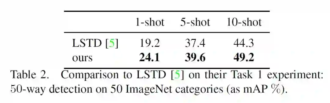 另一方面,在少样本的检测任务上,RepMet 与现有的唯一一个 LSTD 方法做了对比,取得了当前最好的少样本检测精度: