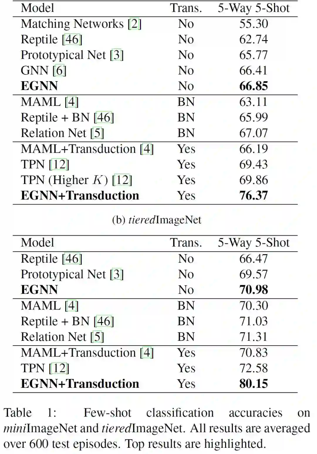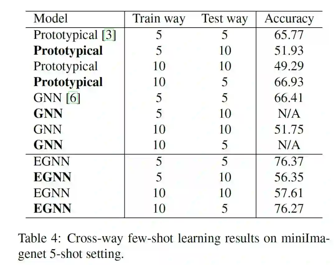 具体到实验部分,EGNN 采用了 miniImageNet,tieredImageNet 两个标准数据集,图像种类数目由 100 到 608 类,图片数目也分为较少和较多,且 tieredImageNet 还具有分层级的图像种类类别结构,EGNN 尝试从数据体量大小,种类多少,任务难易程度来比较从而证实加入 EGNN 中边属性后的网络优越性,最终实验结果如下图所示,平均起来比之前提出的各类 GNN 在少样本分类任务上确实有不错的精度提升: