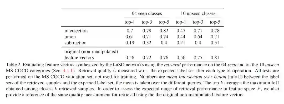 在实验过程部分,论文主要采用了 MS-COCO 2014 与 celebA 的数据集来进行实验和对比分析,将 COCO 数据集的 80 的物体类别随机分成 64 个已知类别与 16 个未知类别,并且使用平均精度(mean Average Precision,mAP)来衡量 LaSO 模块的学习能力,结果具体如下: