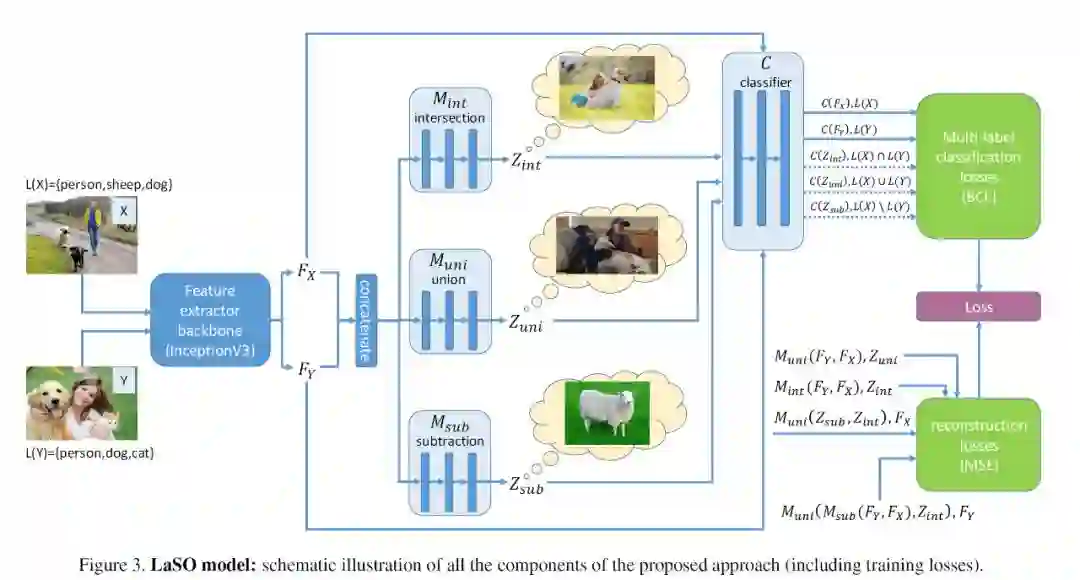 LaSO 模型接受一对图片 X,Y 为输入,分别进入骨干网络 B(文章采用 InceptionV3 以及 Resnet 作为特征提取网络)进行特征提取得到特征 Fx,Fy。在对两张图片的特征进行连接之后,根据我们希望学到的图像中个体类别的交,并,补,所以连接好的特征分别进入 LaSO 的交、并、补网络模块 Mint,Muni,Msub 中学习合成对应的特征 Zint,Zuni,Zsub,特征 Z 可以认为是对应着一张假设的图像 I,这张图像 I 中的个体类别恰好对应着输入 X,Y 的标签的并/交/补,举例说明 Zint 可以看做假设图 I 的提取特征,而图 I 的标签 L(I)正是输入 X 与 Y 的标签交集。