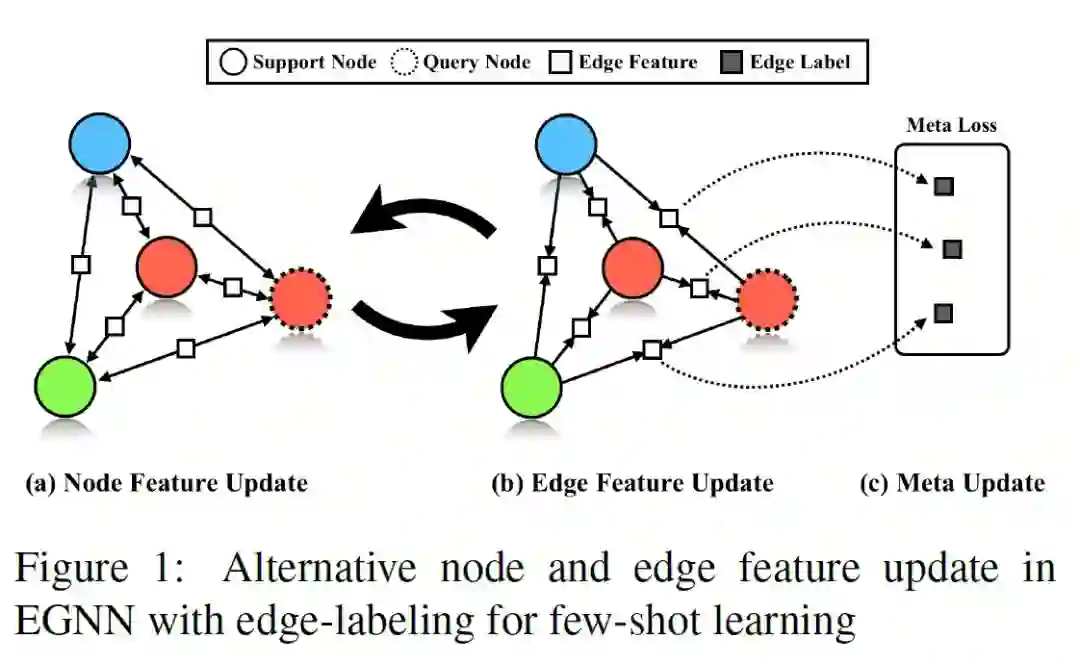 在图中首先更新节点特征,之后再更新节点之间连接边的特征,因为一组节点的特征有变化,进而也会影响到连接边上的特征,以及衡量节点之间的类内相似度(intra-cluster similarity)与类间差异度(inter-cluster dissimilarity)的参数也会对应得到更新,在边和点的特征都得到更新之后,计算边损失(Edge Loss),用 episodic training 的训练策略来更新 EGNN 的权重。