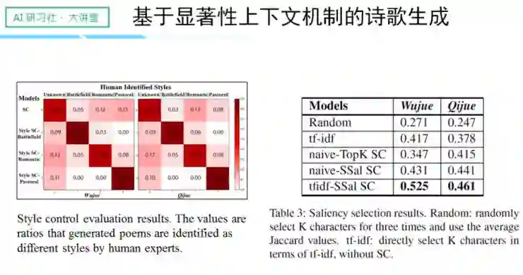 右边是人类评测的结果,对角线越明显,说明风格的识别率越高。一下生成十种风格的诗歌,还能取得这么高的识别率,说明实验的结果非常好。