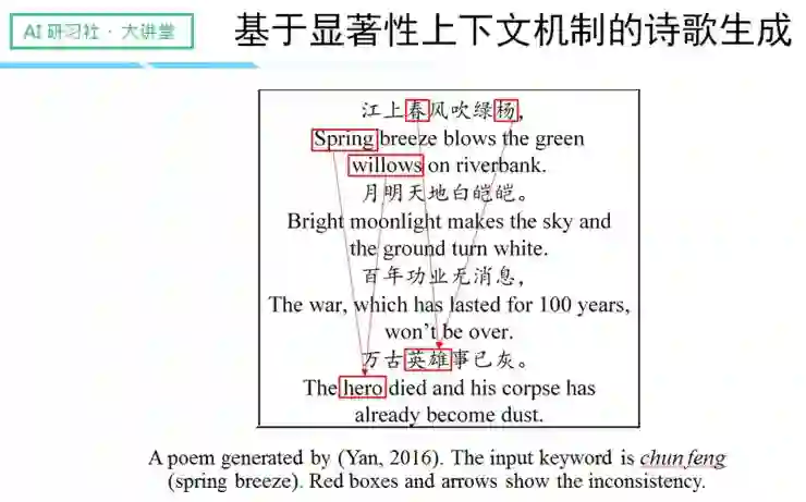 以这首诗为例子,诗歌主要以「春风」为关键词,通过 2016 的某个模型进行生成后,我们发现上下文的连贯性非常差。明明前两句描述的是比较和煦的景色,后两句却突然转变成比较悲怆的边塞风格。也就是说,前半部分与后半部分的主题、风格和内容完全不一致,而且中间也缺乏必要的过渡,关联性较差。
