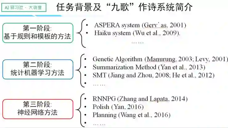 关于自动诗歌的生成,业界的研究主要经历了三个阶段: