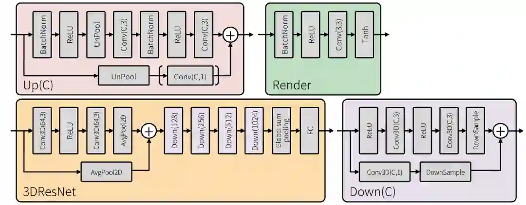 图4. 论文中使用的块细节。"Conv(C, k) "表示具有C通道和(k×k)内核的二维卷积层。"Conv3D(C, k) "表示具有C通道和(k×k×k)核的三维卷积层。"UnPool "表示一个具有(2×2)核和stride为2的二维 unpooling layer 。"AvgPool2D "表示沿空间维度的二维平均池化层,核为(2×2),stride为2。请注意,它并不沿时间维度进行池化操作。"DownSample "表示下采样操作。如果输入的三维特征图的每个维度的大小都大于1,该操作符就会沿着其轴线进行平均池化操作(如果在进行平均池化操作时大小为奇数,则目标轴的padding被设置为1)。否则,不对该轴进行 average pooling 。Up(C) "中的(-)表示,如果输入通道的数量与输出通道的数量相等,则不插入括号内的块