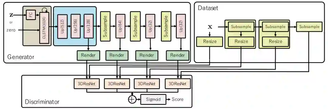 在视频数据集上训练生成对抗网络(GAN)面临的一个挑战就是:视频数据集的规模太大,而且每个观测值都很复杂。一般来说,训练GAN的计算成本随着分辨率的提高而呈指数级增长。在这项研究中,提出了一种新型的高分辨率视频数据集无监督学习的内存效率方法,其计算成本仅与分辨率呈线性比例变化:具体的,通过将生成器模型设计成小型子生成器的堆叠,如图1所示,并以特定的方式训练模型来实现这一目标。训练时,在每一对连续的子生成器之间引入一个辅助子采样层,将帧率按一定比例降低。这个处理过程可以让每个子生成器学习不同分辨率下的视频分布情况,由此只需要几个GPU来训练一个高度复杂的生成器,该生成器在起始得分方面远远超过了前者。
