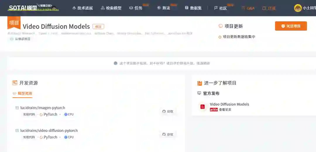 当前 SOTA!平台收录 Video Diffusion Models 共2个模型实现资源。