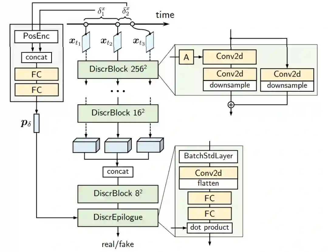 图13. 每段视频k=3帧的鉴别器结构。在StyleGAN2鉴别器的基础上所做的唯一变化是在16个分辨率下串联激活通道,并在帧间时间距离的位置嵌入上调节模型