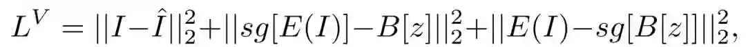 其中,E为编码器。搜索到的结果z∈{0, 1, . . . , N - 1}_h×w被B嵌入,并由解码器G重构回Iˆ。VQ-VAE的训练损失函数为