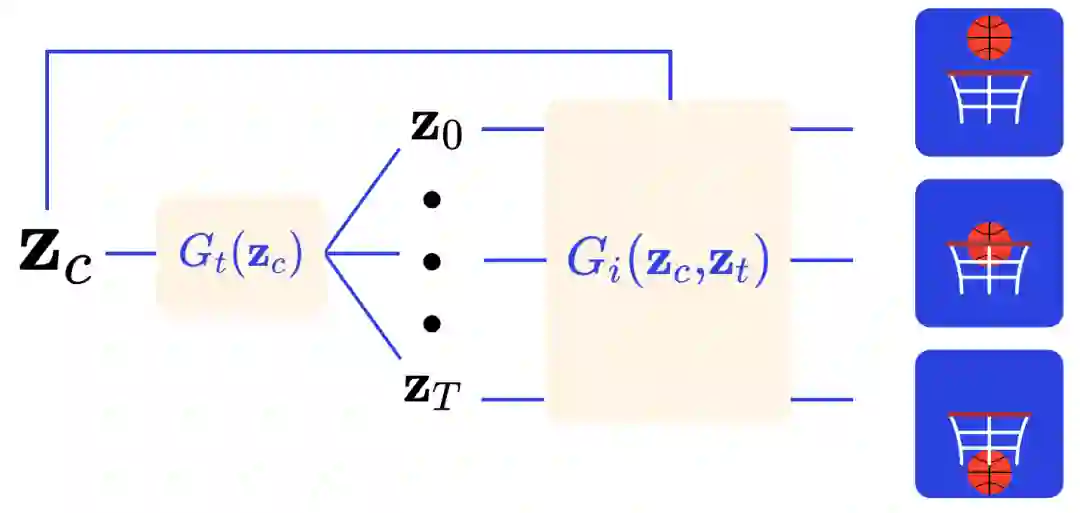 图5. G_t将潜在变量z_c转换为一系列的temporal vectors z0, z1, ..., zT。每个z_t与z_c串联并转化为一个图像。上述图像被连接起来组成一个视频
