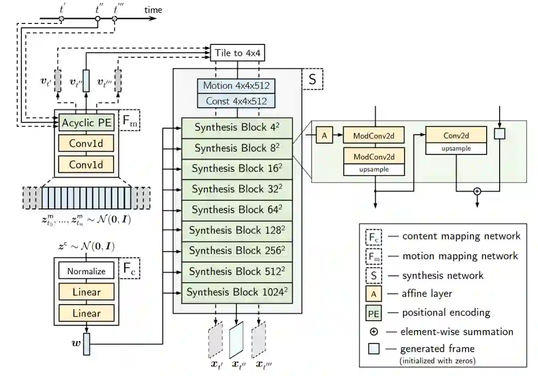 常用于视频生成的Conv3D层有很多限制,比如计算成本相当高。规避对3D卷积的需求的一个方法是将视频作为一个具有时间坐标的连续信号。为了使这种方法奏效,必须解决几个问题:首先,现有的基于正弦/余弦的位置编码是循环的,不依赖于输入,这对视频是不利的,因为我们希望不同的视频在帧之间有不同的运动,而且视频不应该循环。其次,对完整视频的训练在计算上是很昂贵的,因此生成器必须能够从每个片段只有几帧的稀疏输入中学习。最后,鉴别器需要处理以不同时间距离采样的帧,以应对稀疏的输入问题。总之,StyleGAN-V不是自回归的,不使用Conv3D,而是在稀疏的输入上进行训练,并且对图像和视频使用单一的鉴别器而不是两个单独的鉴别器。