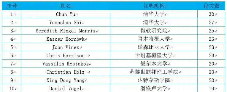 报告中的人才篇,对人机交互领域的顶级学术会议及期刊论文进行系统性的筛选和深入的挖掘,以全球视角对人机交互领域顶尖学者的地区分布、国家分布以及性别差异进行统计分析,并对中国专家学者的分布情况、国内外的人机交互领域的代表性学者的个人基本情况和主要成就进行了简要总结。另外,报告还对近三年在所选期刊或会议上发表论文数最多的 100 名学者进行了统计排名。下表展示了人机交互领域近三年的高产学者名单前十名。