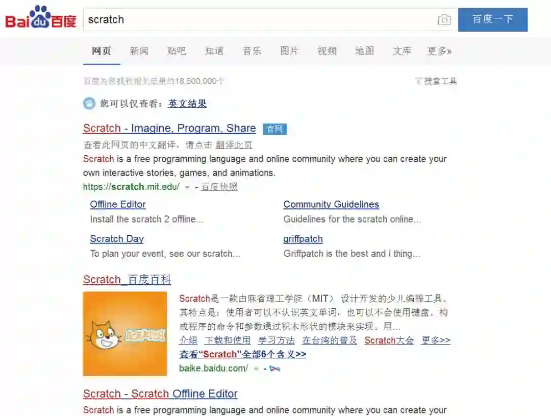 回到正题,我们该怎么向小朋友解释搜索中的原理?需要用理论结合实践,输入Scratch,搜索网站便会在大量数据中查找Scratch相关数据。