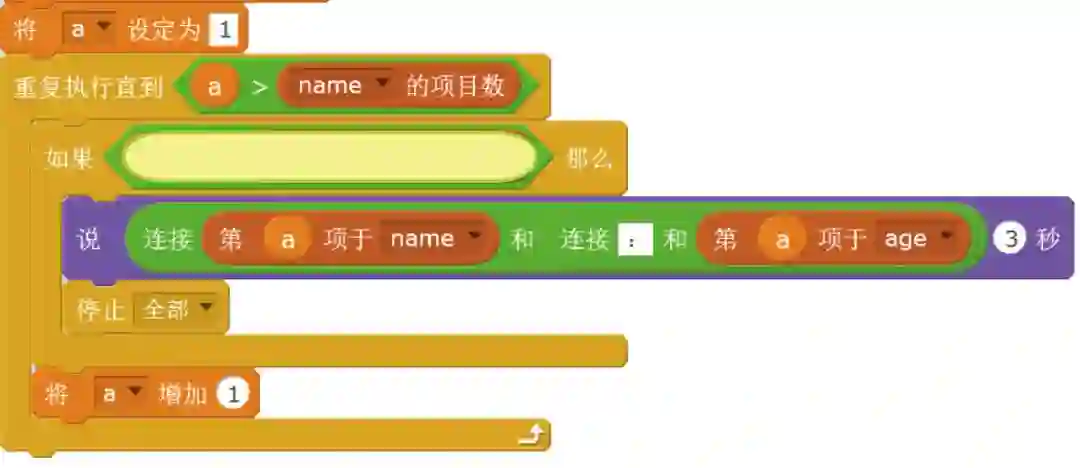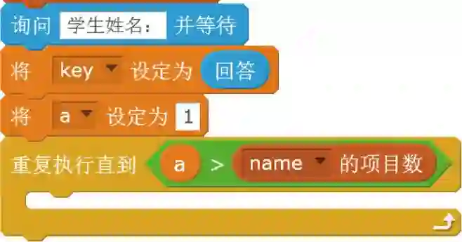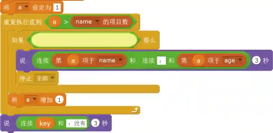 4. 如果在列表name中找到key,则由Scratch小猫说出相应的学生姓名和年龄,并终止程序。那么绿框 1 处应该填写什么内容?