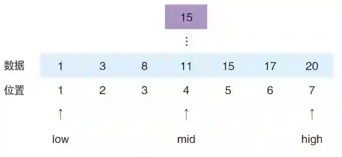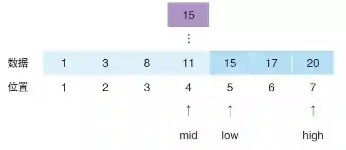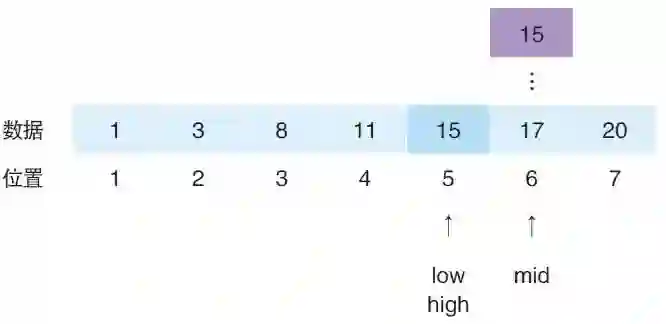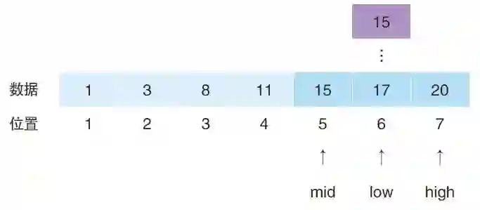 3. 15 大于 11,因此 mid 位右侧的数据成为新的搜索范围。计算可知,新范围中的low 位(即 mid+1)是第 5 位。