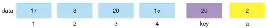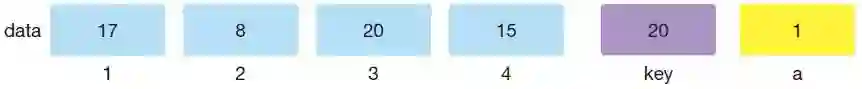 1. 将列表 data 设为 17、8、20、15。将变量 key 设为 20。将变量 a 设为 1。