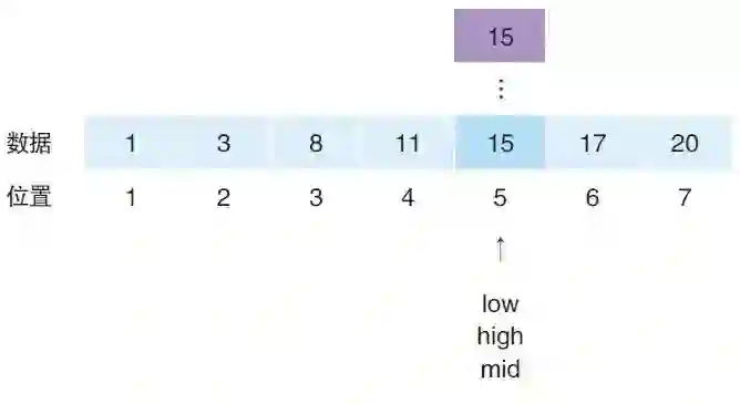 6. 再次计算 mid 位是第 5 位。因此将第 mid 位的数据(=15)与15进行比较,