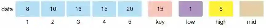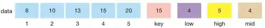 1. 将 8、10、13、15、20 添加到列表 data。 将变量 key 设为 15。分别将变量 low和 high 设为 1 和 5,low 不大于 high,因此移动到下一步。