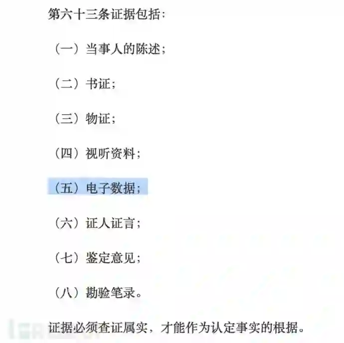2012年,《中华人民共和国民事诉讼法》经过修正后新增了“电子数据”。最高法对于“电子数据”的解释为“通过电子邮件、电子数据交换、网上聊天记录、博客、微博客、手机短信、电子签名、域名等形成或者存储在电子介质中的信息。”