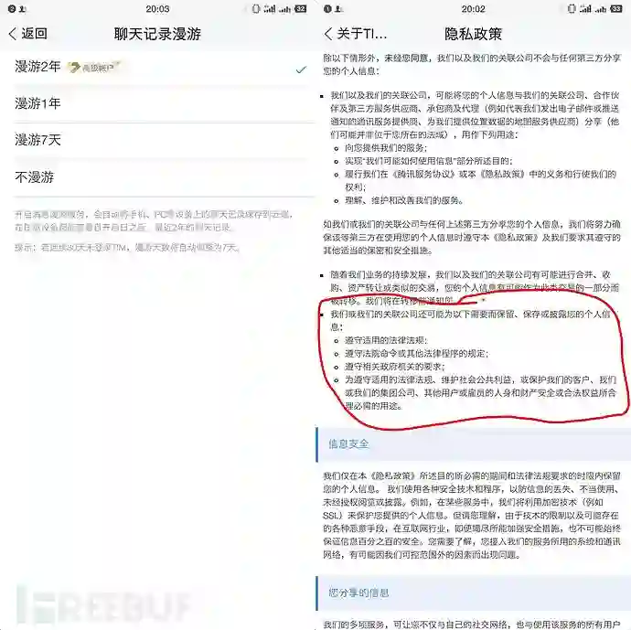 以QQ为例,QQ聊天记录是支持云端漫游的,也就是聊天信息会上传云端,最长可以保存2年。而在其隐私协议中有提到,在法院命令、政府机关要求的情况下,会披露用户的个人信息。这样能够给相关机构调查、办案提供极大的便利性。这不仅仅是腾讯,只要在国内运营的互联网企业基本都遵从这一准则,哪怕是苹多次拒绝FBI的解锁iPhone请求的苹果公司。