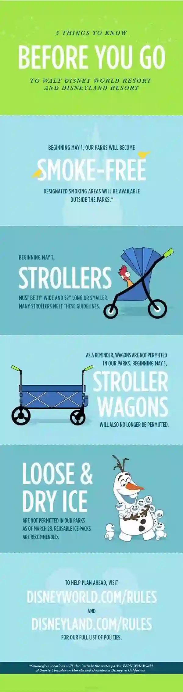 3月28日,华特迪斯尼世界和迪斯尼乐园在官方博客公布了若干乐园新规定,包括拆除公园内的吸烟区,“从2019年5月1日开始,吸烟区将在沃尔特迪斯尼世界和迪斯尼乐园主题公园,水上公园,ESPN体育世界和加州迪士尼市中心消失。公园入口,度假酒店和迪士尼温泉将设有吸烟区。”
