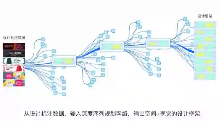 规划网络的基础来源于设计师的创意设计模板和基本元素素材,设计师将大量设计素材进行结构化数据标注,最后经由一系列人工智能网络学习,输出空间+视觉的设计框架。