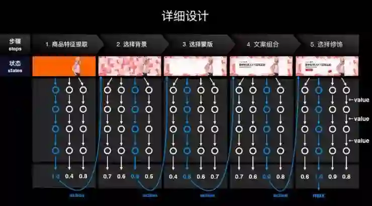 行动器根据「鲁班」收到的设计需求,从学习网络中抽取设计原型,并从元素中心中选取元素,规划输出多个最优生成路径,完成图片设计。