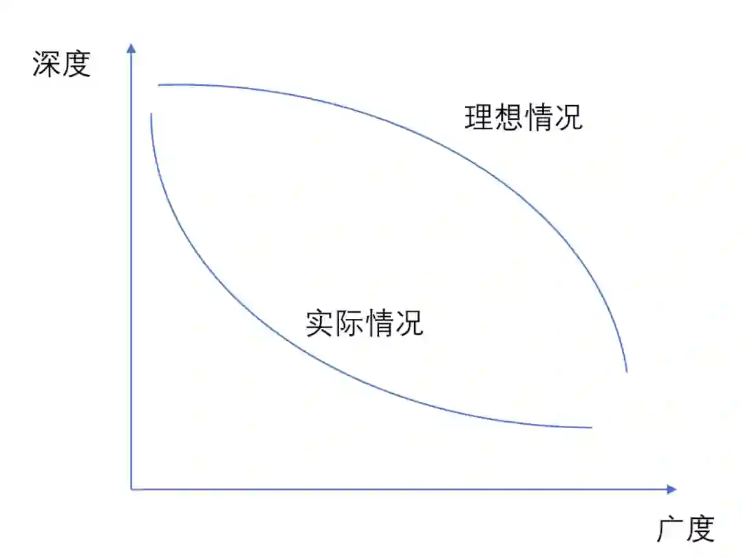 (5)合理处理知识的扁平化与纵深化矛盾。在实际知识图谱工程中,知识的广度(对应扁平化)与深度(对应纵深化)往往是一对不可调和的矛盾。为了广度,往往要牺牲深度;为了深度往往要牺牲广度。前者以通用知识图谱为例,通用知识图谱较为宽广,但缺乏深度,体现在平均关系数小于相应的领域知识图谱。深度知识在风险管控、安全防范等领域十分重要。恶意意图的行为往往具有隐蔽性等特点,难以通过简单语义关联发现。因而相关图谱的建设要往纵深方向发展。如图15.15所示,实际的知识图谱往往需要在知识的深度与广度之间进行平衡。
