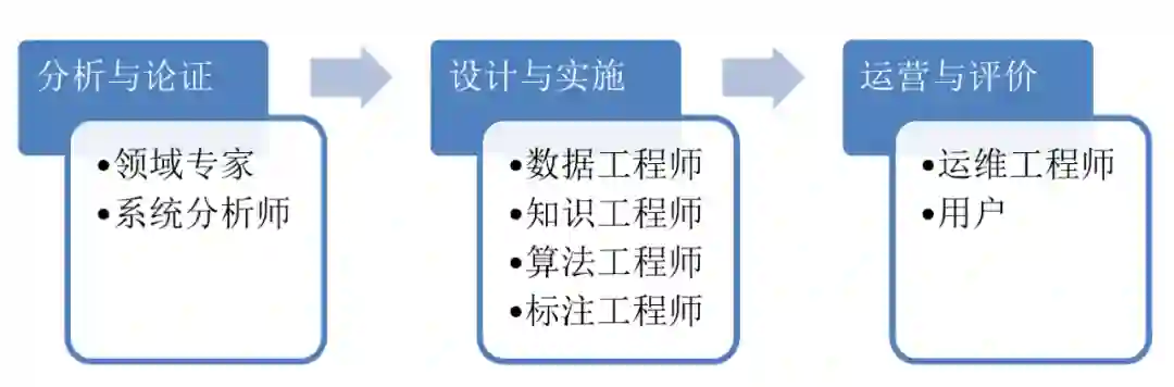 这里的人是指知识图谱系统的各类人类角色。人是知识图谱系统的发起者、设计者、实施者与评价者,是知识图谱系统的核心。知识图谱中的人员涉及众多角色,按照知识图谱系统生命周期的三个主要阶段可以分为几类角色。(1)在分析与论证阶段,需要领域专家与知识图谱系统工程师共同开展需求分析,论述知识图谱系统建设的必要性与可行性。必要性从应用需求的迫切性与业务价值等角度进行评判。可行性从数据资源禀赋、应用要求以及知识表示的复杂程度等角度来评估,并进一步合理规划知识图谱系统建设所需要的数据资源、人员投入以及成本投入等等。(2)在设计与实施阶段,需要各类工程师完成数据治理、知识加工、算法设计以及样本标注等各环节的任务。(3)在运营与评价阶段,需要运维工程师对于知识图谱系统进行长期运维,需要用户对系统实施效果加以评价。