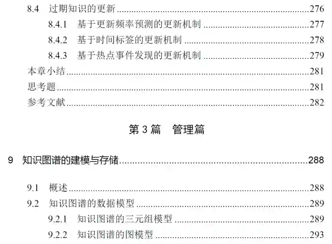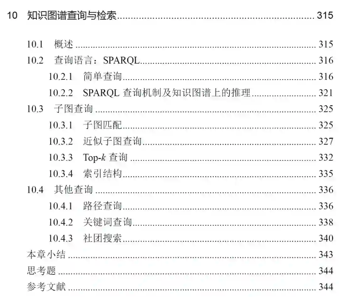 知识管理层旨在实现知识图谱数据的有效管理和高效访问,其主要模块如图15.11所示。知识图谱的管理涉及知识图谱的建模、存储、索引和查询。在建模部分明确知识图谱的数据结构。存储部分完成知识图谱在磁盘或者分布式环境下的存储与组织方式。为了加速大规模知识图谱上的查询通常需要建立相应的索引结构,包括基于子结构的索引和关键字索引。最终基于这些索引方式实现各类查询,包括特定子图结构的查询(比如路径、社区、一般子图等等)和关键字查询。
