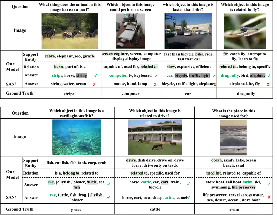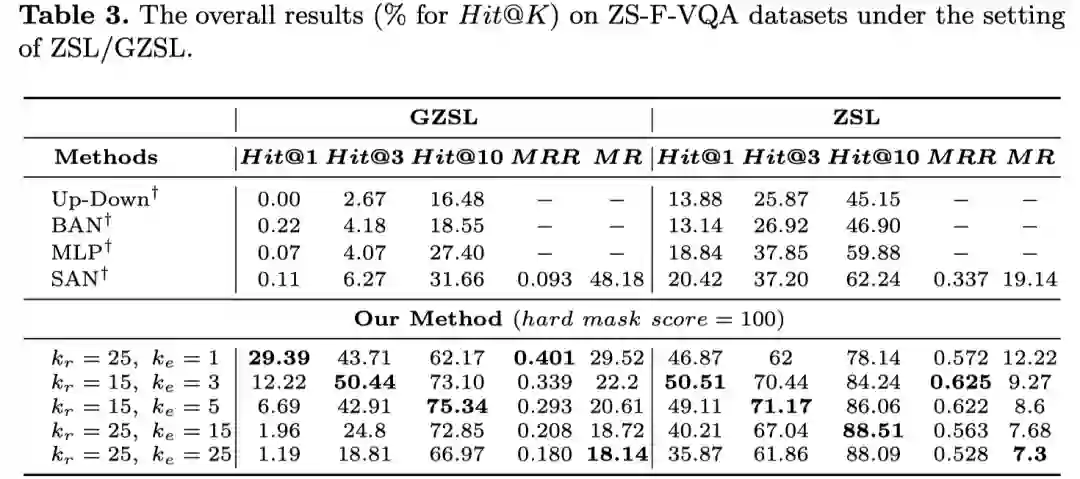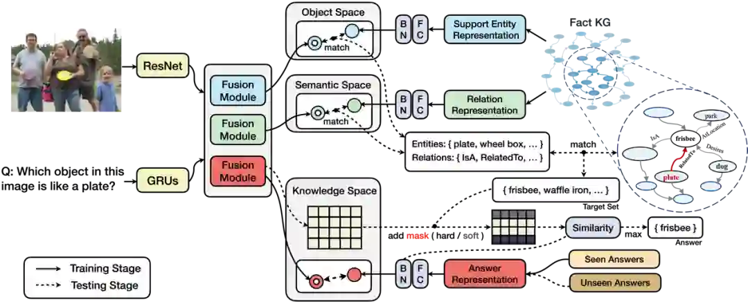 人天生就具有强大的领域迁移能力,且这种能力往往不需要很多的样本,甚至仅需一些规则描述,根据过往的经验与知识就可以迅速适应一个新的领域,并对新概念进行认知。基于此假设,我们设计零样本下的外部知识VQA:测试集答案与训练集的答案没有重叠。即,在原有F-VQA数据集基础上,提供以Seen / Unseen答案类别为划分依据的ZS-F-VQA数据集,并提出了一种适用于零样本视觉问答(ZS-VQA)的基于知识图谱的掩码机制。区别于传统VQA基于分类器的模型设定,我们采取基于空间映射的方法,建立多个特征空间并进行知识分解,同时提出了一种灵活的可作用于任何模型的k mask设定,缓解少样本情况下对于Seen类数据的领域漂移。我们的方法提供了一种多模态数据和KG交互的新思路,实验证明在多个模型上可取得稳定的提升,更好地结合外部知识同时缓解误差传播对于模型性能的影响。