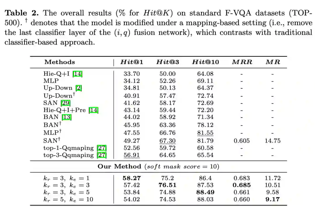同时,ZS-F-VQA数据下hard mask 取得最佳效果,F-VQA数据下soft mask在不同的掩码分值取值(soft mask)下取得最佳效果,证明hard mask和soft mask的设定是有必要的。