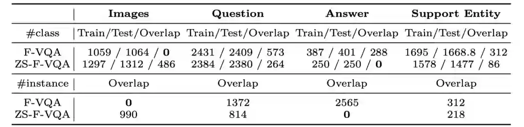 注意到,原始F-VQA是根据图片进行数据划分的,因此在image上的重叠(overlap)是0,而ZS-F-VQA在answer上重叠为0。
