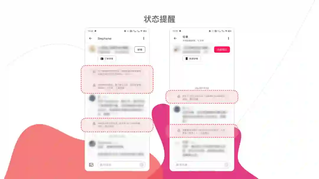 视觉清晰可辨,状态及时提醒。Airbnb的提醒以沉浸式低明度的气泡弹出的形式出现,通过气泡的包裹与正文内容产生可见的层级区分。而对于用户发出的内容,会以信息回执的方式提示当前信息状态。