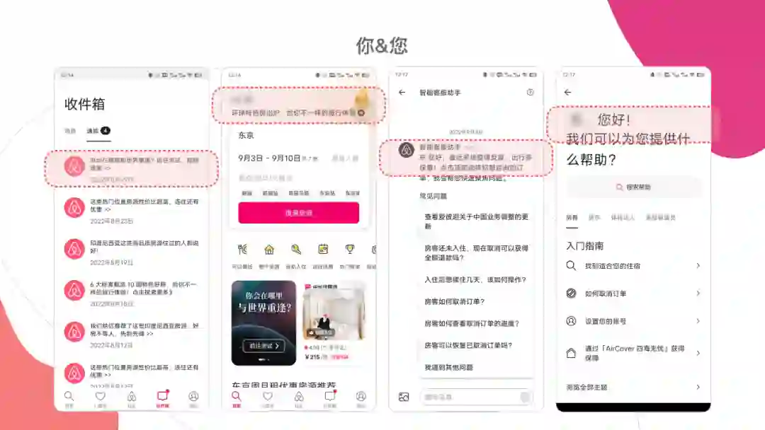 通常在中文的语境下,“你”多用在关系亲密的人身上,常在协作的环境中使用;而“您”表明二者处于不同辈分的情况下使用。因此爱彼迎在通知上使用的“你”就像是身边的朋友或是同龄人,给人的感觉更加亲切,有一定的社区归属感。而在与客服沟通、或是订单服务时,用户处在位置较高的地方,则使用您更为合适。