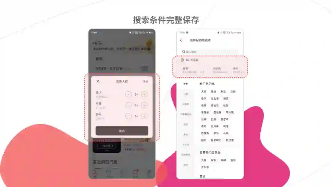 Airbnb为客人保留了包含位置、时间、人数等完整的搜索条件历史,在点击搜索框时会将其展示在靠近搜索区域的附近。