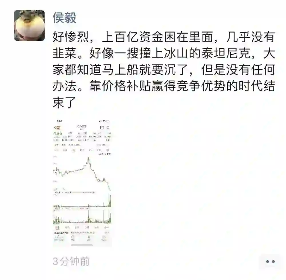 近日,盒马CEO侯毅在朋友圈向叮咚买菜开炮,称叮咚买菜上百亿资金困在里面,船要沉了,靠价格补贴赢得竞争的时代结束了。侯毅还配了一张叮咚买菜股价的图片。(凤凰网财经)