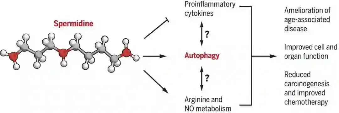我们也不能忽略其他组分,比如蘑菇也富含维生素D,硒,谷胱甘肽,B族维生素,纤维等等。另一种神奇物质亚精胺Spermidine 也能在蘑菇里找到。而这个东东最近研究提示有抗老化的功能。有些特殊的蘑菇也含有特殊组分,比如猴头菇里含有猴头菌烯酮hericenones 和猴头菌多醇erinacine 可以促进神经生长因子的生成。这些物质,也值得有研究。关于亚精胺,科学家们看图:
