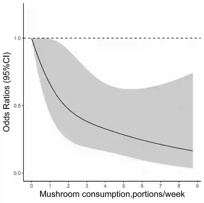 具体到数字:摄入蘑菇少于150克的老人有大约五分之一患有轻度认知障碍,而这个比例在摄入蘑菇大于300克人群里低于十分之一。这个关系在调整了相关混杂变量后依然成立,而且有清楚的剂量关系。蘑菇吃的越多,MCI的风险越低。