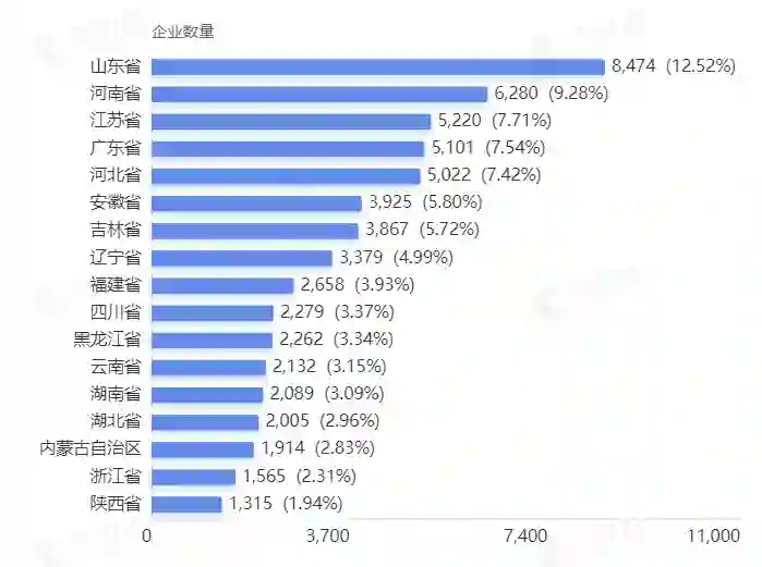 从分布区域来看,山东位居第一,占全国总数12.52%,河南、江苏分列二三位。