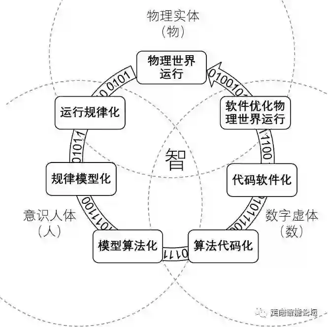 笔者在《智能制造术语解读》书中“软件定义制造”词条中写到:“结合信息化百人会专家安筱鹏博士在《软件视角中的未来工业》一文中提出的观点与本文作者在《三体智能革命》一书中的三体智能模型,下面给出了基于三体(物理实体、意识人体、数字虚体)互动实现软件赋能与使能的逻辑闭环:物理世界运行(映射为人类意识活动)→运行规律化→规律模型化→模型算法化→算法代码化→代码软件化→软件优化物理世界运行(和人类行为)”。如图1所示。