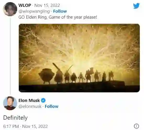 近期 TGA 2022 游戏大奖提名公布,《战神:诸神黄昏》和《艾尔登法环》等大作获得年度最佳游戏提名。艺术家 WLOP 发推支持《艾尔登法环》成为年度游戏,马斯克则在推文互动中回复道,“当然。”在互动中有网友表示游玩中途被劝退了,问马斯克是否通关。马斯克声称自己已经通关了,尽管有时候看起来几乎是不可能的。