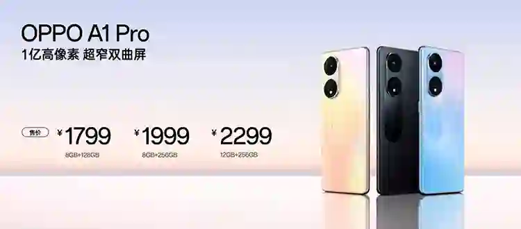 OPPO 今日晚间正式发布了 OPPO A1 Pro 手机,售价 1799 元起。OPPO A1 Pro 搭载高通骁龙 695 处理器,配备 6.7 英寸 2412×1080 分辨率 OLED 双曲面屏,支持 120Hz 刷新率,拥有 4800mAh 电池,支持 67W 快充。该机拥有朝雨蓝、晨曦金、月夜黑三款配色,后置双圆环双摄,搭载 108MP 主摄,以及 2MP 凑数镜头,前置 16MP 居中打孔镜头,厚 7.7mm,重 171g。此外,该机配备了光学屏下指纹识别、NFC、立体声双扬声器等,支持最多 1TB 存储卡扩展。