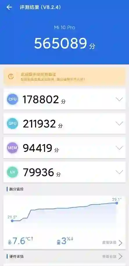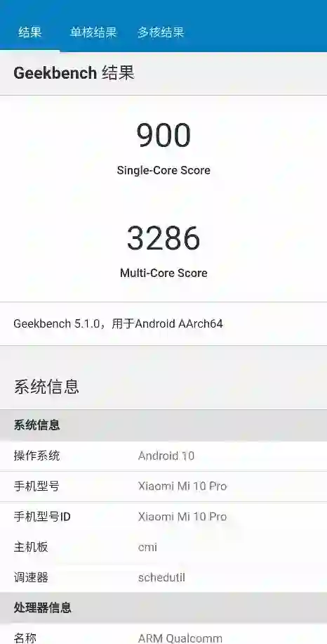 国内首发的 骁龙865 处理器,基于 Cortex-A77 深度定制,综合性能相比 855 有 20% 的提升,AI性能翻倍的同时,功耗还下降了 35% 。经过实测,小米10 Pro 安兔兔跑分 565089 分,Geekbench 单核跑分 900 分、多核 3286 分。